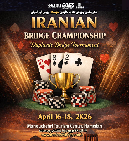 Iranian Card Games Championship (Bridge Format) According to the Public Relations of the Iranian Humanitarian Games Alliance, a championship tournament for card games in the Bridge format will be held from April 16 to April 18, 2026 in Hamedan, Iran. For registration and further information, please visit the official website of the Iranian Mind Sports Committee. www.iranianmindsports.ir